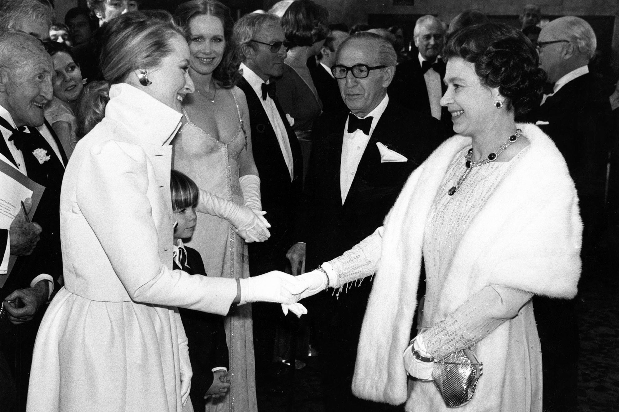 1979 – COM OUTRA RAINHA | Pouco depois, em 1978, Meryl estrelou O Franco-Atirador, épico de Michael Cimino que a impulsionaria para a fama. No começo do ano seguinte, a Rainha Elizabeth II compareceu a uma exibição especial do filme, e o encontro entre duas realezas foi registrado na foto acima.