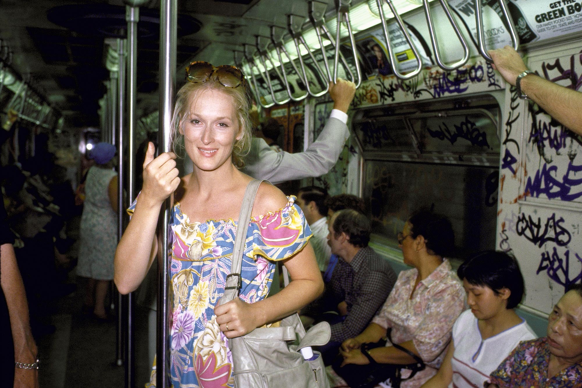 1981 – NO METRÔ | Essa famosa foto de Streep no metrô novaiorquino é verdadeira, mas as histórias normalmente associadas a ela (dizendo que Meryl foi rejeitada para um papel logo antes da imagem), não. Aqui, ela já era uma estrela oscarizada que só não perdeu o jeitinho “gente como a gente”.