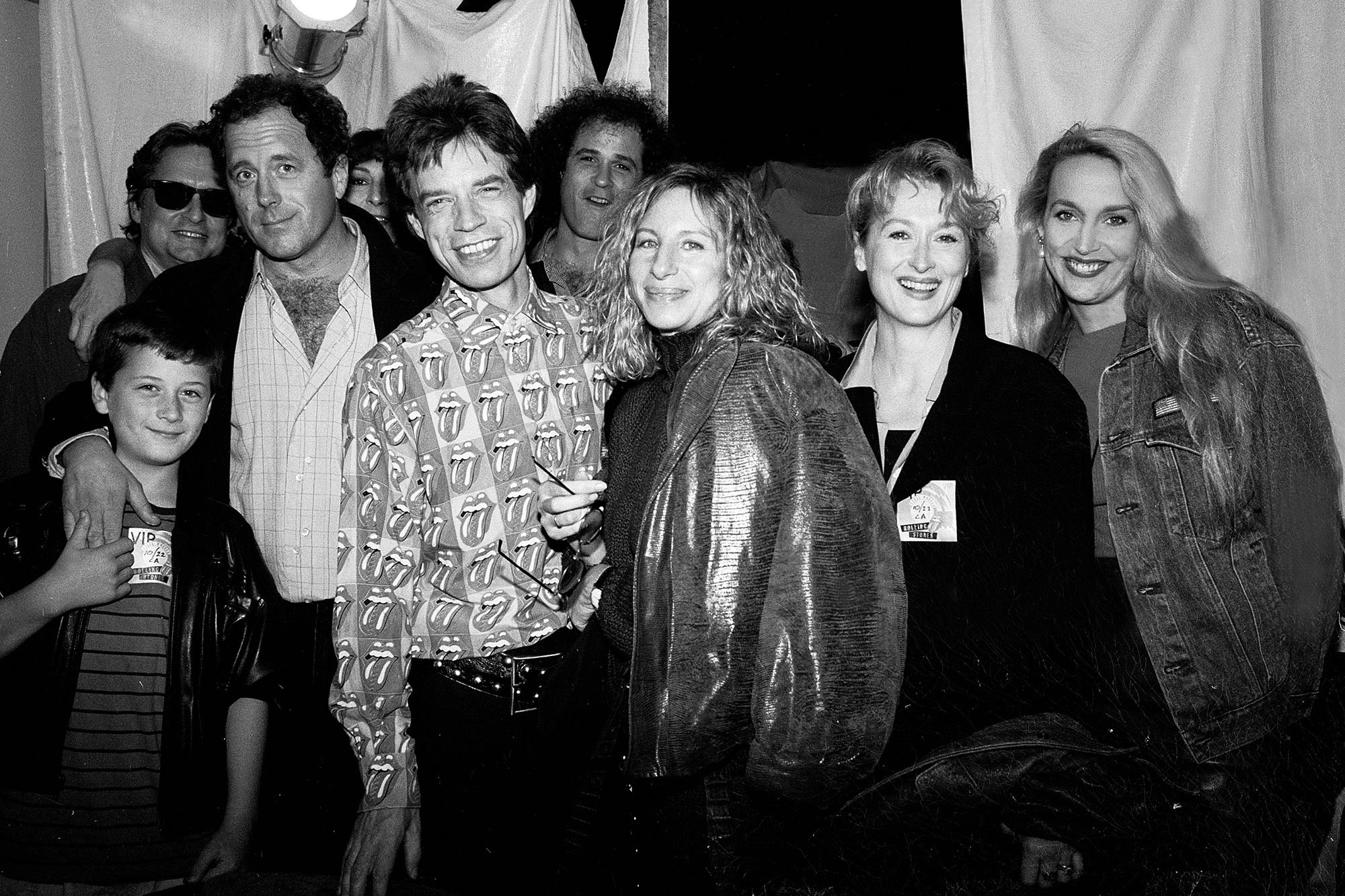 1989 – VIDA DE BALADA | Apesar de sempre elegante e modesta, Streep não se privou dos privilégios de uma vida em Hollywood. Nessa foto, aparece com Michael Douglas e Barbra Streisand nos bastidores de um show do Rolling Stones – no centro, o frontman Mick Jagger, e na ponta direita sua espoca da época, Jerry Hall.