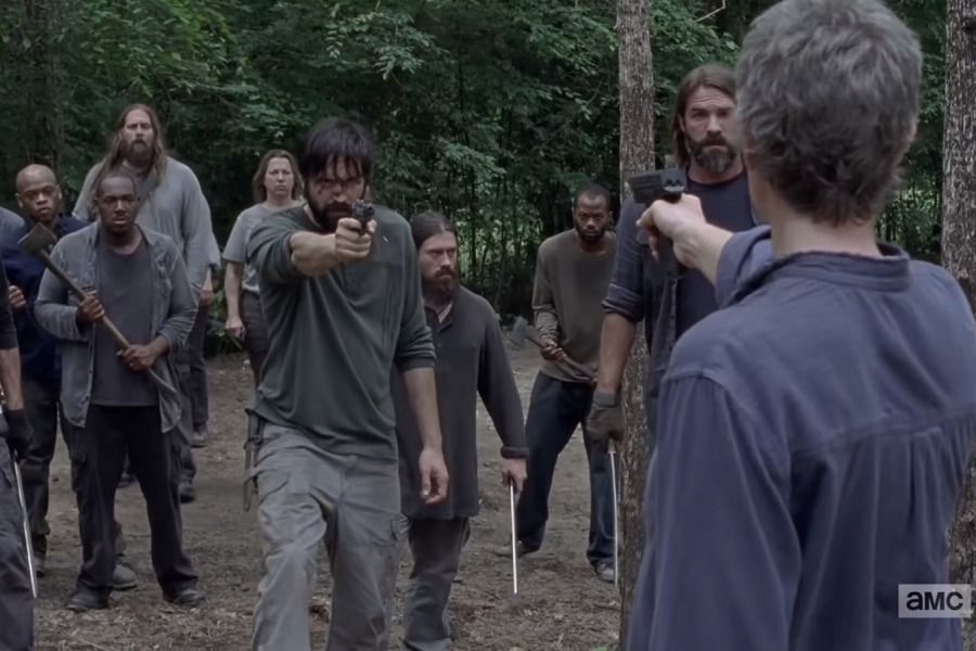 Já vimos o personagem em situação de tensão com Carol (Melissa McBride), onde um está apontando a arma para o outro. Posteriormente, ele aparece colocando uma faca no pescoço da sobrevivente.