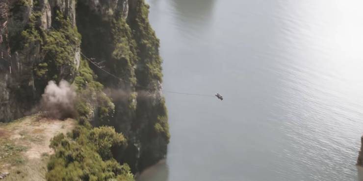 Embora Dom não tenha um jato magnético para pegá-lo (que sabemos), ele ainda decide continuar sua busca por Jakob por todos os meios necessários. Isso leva o trailer a outra das acrobacias ridículas da franquia, quando Dom atinge o poste de uma ponte quebrada para que parte dela possa se prender ao carro.