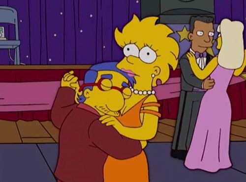 LISA & MILHOUSE (Os Simpsons) | Milhouse sempre teve uma queda nada disfarçada pela filha mais velha dos Simpsons, mas só descobrimos que os dois “foram até o fim” em seu relacionamento em um flashforward no qual vemos Lisa se casando, e um diálogo bem humorado entre ela e Marge revela que os dois perderam a virgindade um para o outro.