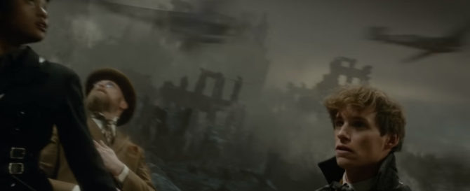 Em um rápido vislumbre, vemos Newt e diversos personagens parados sob escombros de uma cidade, enquanto aviões muito parecidos com o da Segunda Guerra Mundial voam sobre suas cabeças. Parece ser um tipo de presságio, e como a trama de Animais Fantásticos se passa na década de 30, estaria Grindelwald envolvido com o grande conflito entre nações?