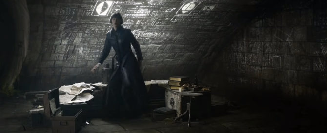 Uma personagem que quase não apareceu no material de promoção é Queenie, irmã de Tina que ainda está apaixonada pelo No-Maj Jacob Kowalski. O que vemos nessa tomada específica é o símbolo de um corvo na parede, o que pode simbolizar um arco mais sombrio para sua personagem.