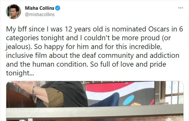 “Meu melhor amigo desde que eu tinha 12 anos foi indicada ao Oscar em seis categorias esta noite e eu não poderia estar mais orgulhoso (ou ciumento). Tão feliz por ele e por este filme incrível e inclusivo sobre a comunidade com deficiência auditiva, o vício e a condição humana. Tão cheio de amor e orgulho esta noite”, escreveu o astro de Supernatural.