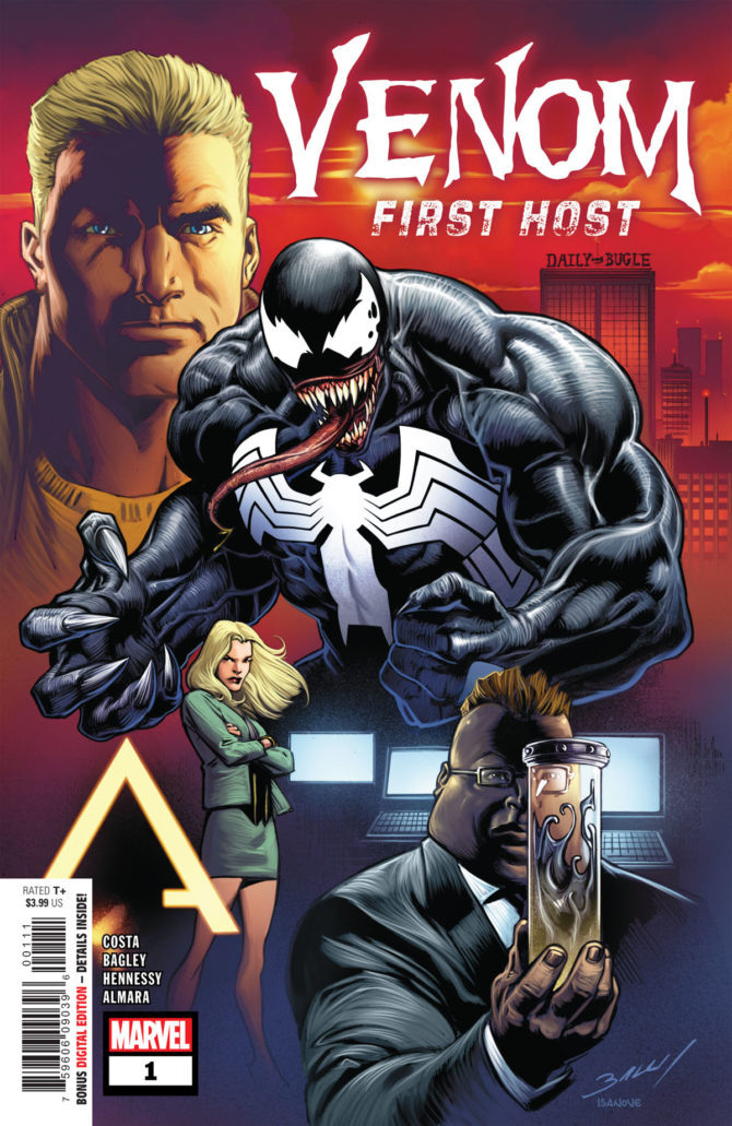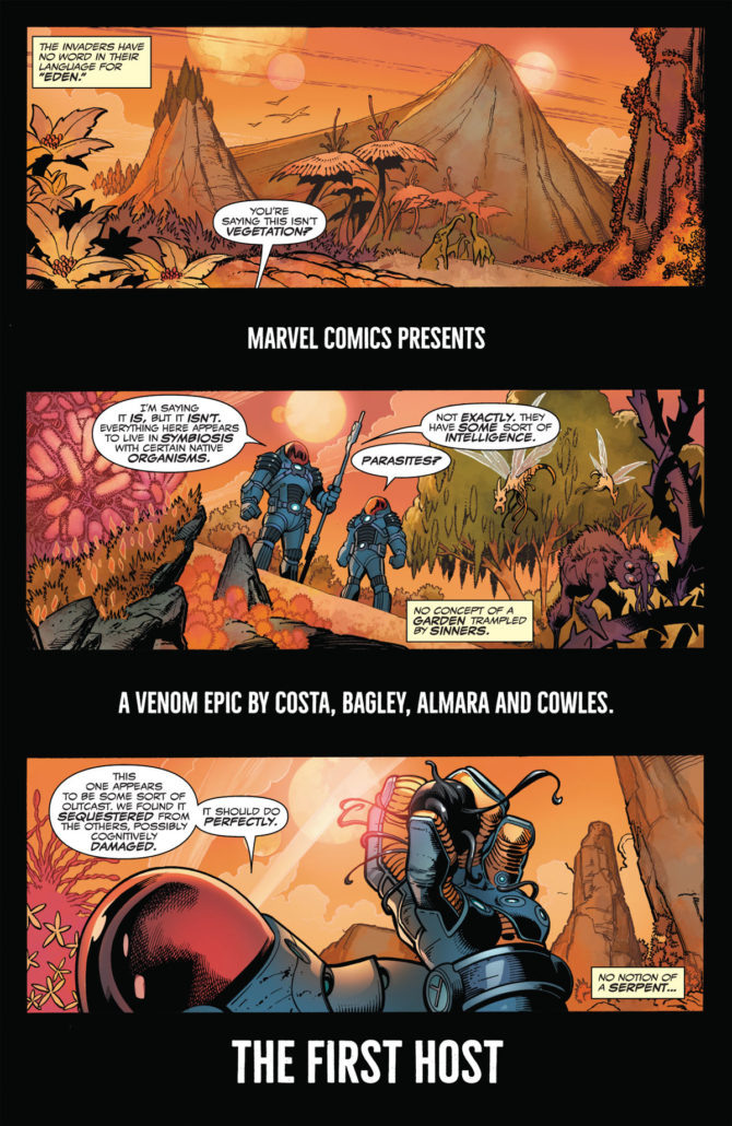 “Mike Costa e Mark Bagley se reúnem para uma história de Venom como nenhuma outra! Antes de Amazing Spider-Man… antes de Venom… existiu o Primeiro Hospedeiro. E esse Primeiro Hospedeiro retornou, precisando da ajuda de Venom – somente se os dois se juntarem novamente, eles poderão evitar uma catástrofe cósmica. Podem Eddie e o simbionte confirar um no outro por tempo o suficiente para salvarem a galáxia, ou será o Primeiro Hospedeiro a ruína de Venom?!”