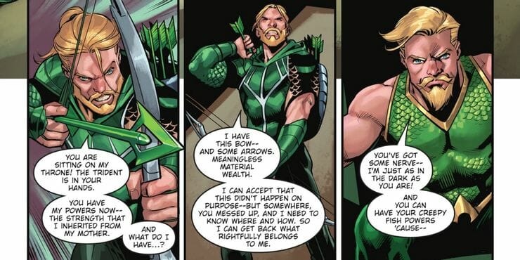 Um efeito disso parece ser essa mudança de posição. O Aquaman simplesmente aparece com a roupa e as habilidades do Arqueiro Verde.