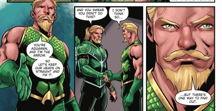 Após a briga, Aquaman e o Arqueiro Verde decidem se ajudar. Dessa forma, os dois começam uma maluca parceria na DC, tentando descobrir como fazer o mundo voltar ao normal.