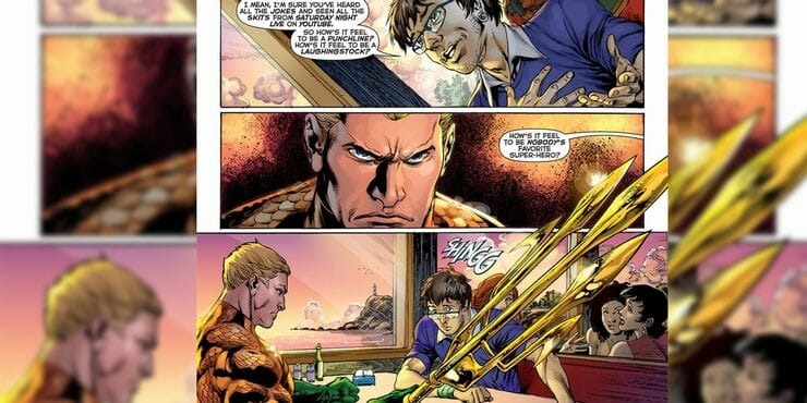 A DC trabalha cada vez mais para que as piadas com o Aquaman parem – principalmente aquelas sobre peixes e os poderes dele. Mesmo assim, uma vez ou outra, a editora provoca os fãs do herói.