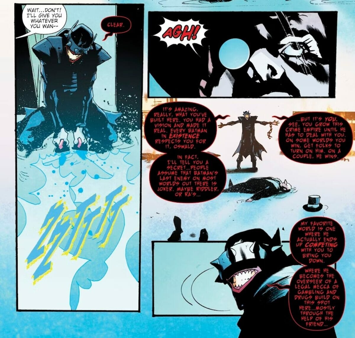 A versão completamente deturpada do Batman explica para o Pinguim, enquanto mata todos os seus guardas, que muitos assumiriam que o Coringa era o inimigo final do Batman, mas, na verdade, Oswald Cobblepot é o maior desafio para o herói.
