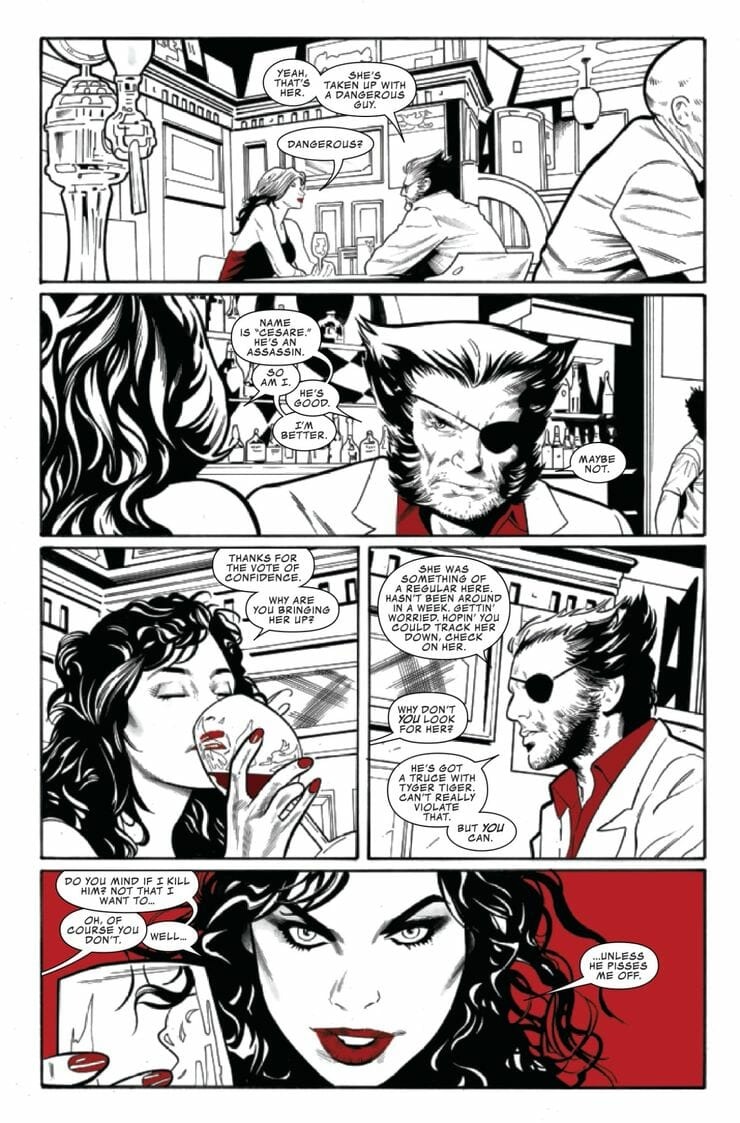 Elektra pergunta por que ele não faz isso sozinho, e ele a informa que Cesare tem uma trégua com Tigre – o que significa que Wolverine não pode fazer nada neste caso. Elektra jura que não vai matá-lo, a menos que ele “a irrite”.