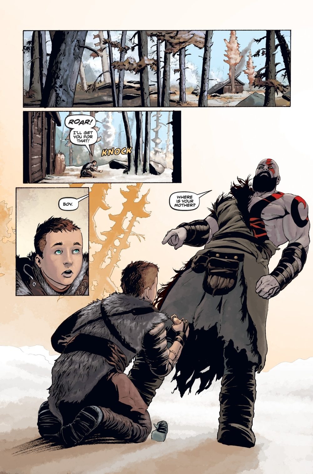A Dark Horse ainda revelou que a história gira em torno de uma briga de Kratos e Atreus contra um culto de berserkers, que começa após ele tentar salvar um estranho sendo atacado por um urso.