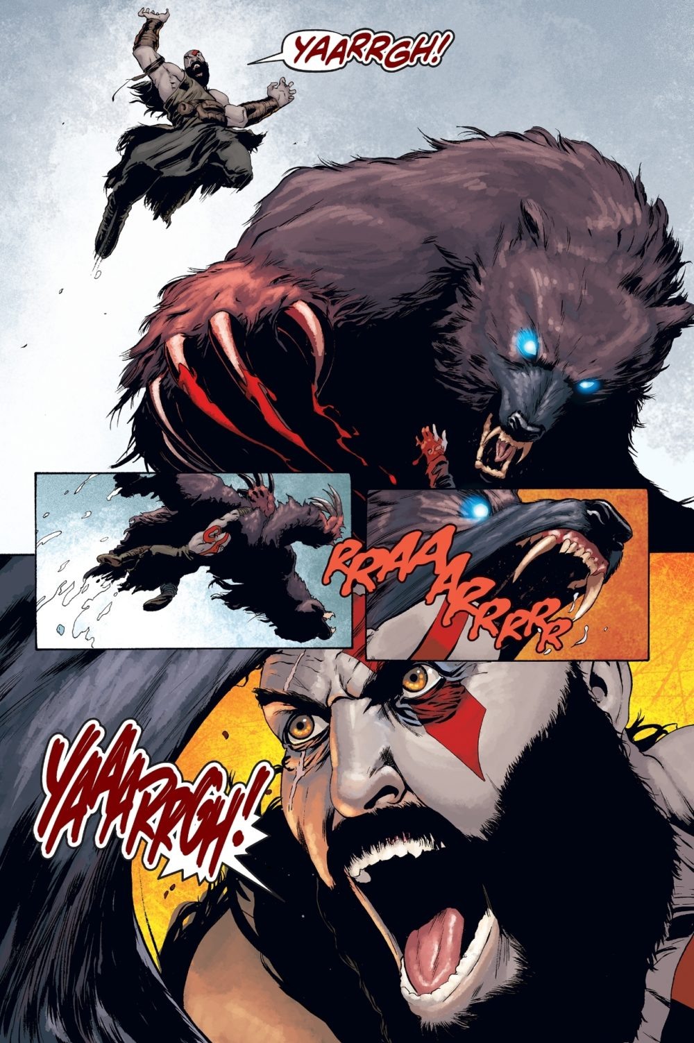 Agora, o ComicBook divulgou algumas novas imagens dessa revista em quadrinhos, que mostram Kratos e seu filho, além de trazer o deus da guerra lutando contra um urso. Veja abaixo.