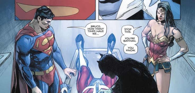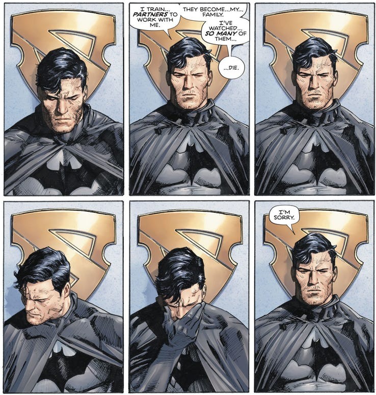 Apesar da boa relação com os outros heróis, Batman sempre agiu sozinho e quase sempre se mantém em defensiva com personagens como o Superman e a Mulher-Maravilha. Em Heroes in Crisis #2 parecia que isso mudaria, mas não foi o que aconteceu.