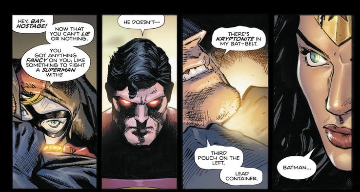 Em uma conversa franca, o Superman pediu se o Batman ainda escondia kryptonita com ele. Batman garantiu que não. Mas, mais uma vez a mentira foi descoberta. Em uma luta contra Arlequina, a vilã consegue o laço da verdade da Mulher-Maravilha, amarra o herói e faz ele revelar a verdade.