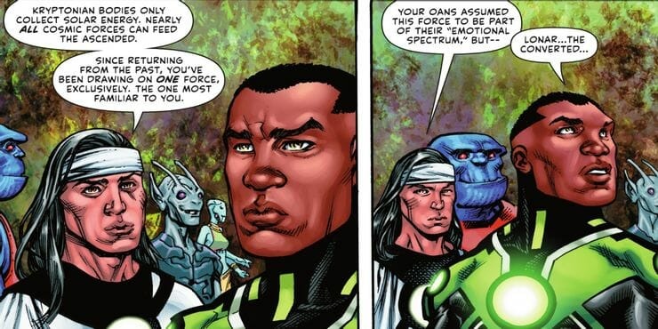 Ele é informado de que os indivíduos de Krypton apenas coletam energia solar, mas aqueles que “ascenderam”, como o próprio John Stewart, podem acessar todas as forças de energia cósmica. No caso, o Lanterna Verde parece ter uma conexão especial com o “Espectro Emocional”.