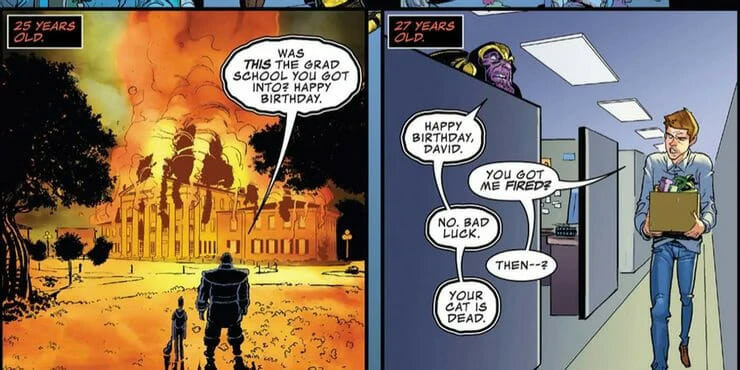 Thanos não se importa se David vive ou morre. O Titã Louco simplesmente retorna a cada aniversário para assombrá-lo e causar problemas.