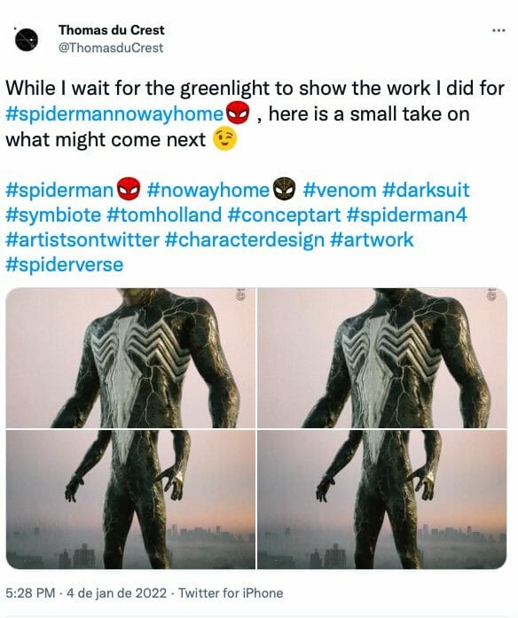O artista de Homem-Aranha: Sem Volta Para Casa Thomas du Crest compartilhou no Twitter imagens do herói de Tom Holland com o traje de Venom. O ilustrador indicou que essa parceria pode ser vista no futuro do universo da Marvel.