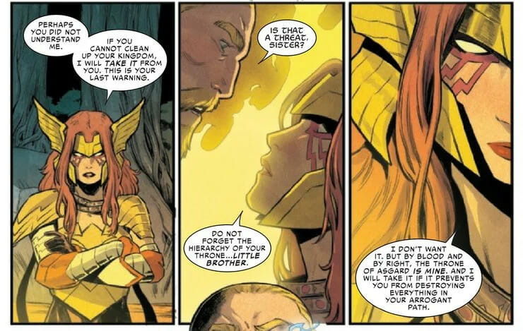 Embora Thor tenha se reconciliado com Loki quando ele abraçou seu destino real e reivindicou o trono de Asgard, outro membro de sua família ressurgiu e anunciou seus próprios planos de substituir Thor à força se ele continuar cometendo erros: Angela.