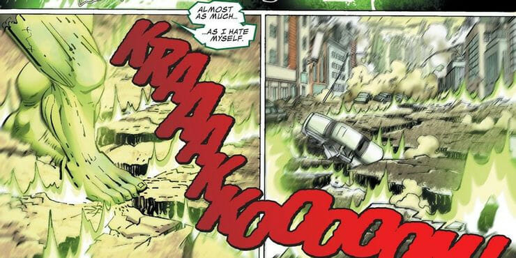A cada passo, o Hulk causava mais destruição. Foi um evento extremamente devastador nos quadrinhos da Marvel.