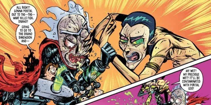 Os dois detonam a Terra em sua batalha. Na história, o poder bruto do Sr. Nimbus fica claro enquanto ele usa suas habilidades para controlar o oceano, colocando Rick e toda a vida humana de joelhos.