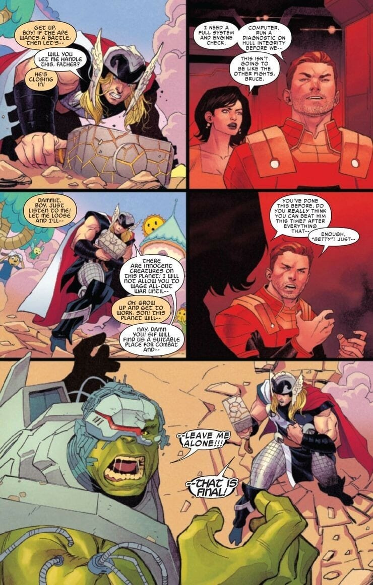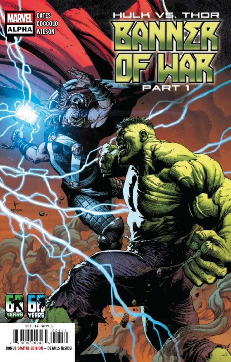 Em uma prévia da revista Hulk vs. Thor: Banner of War Alpha #1, de Donny Cates e Martin Coccolo, vemos os dois lutando pouco antes de serem teletransportados.