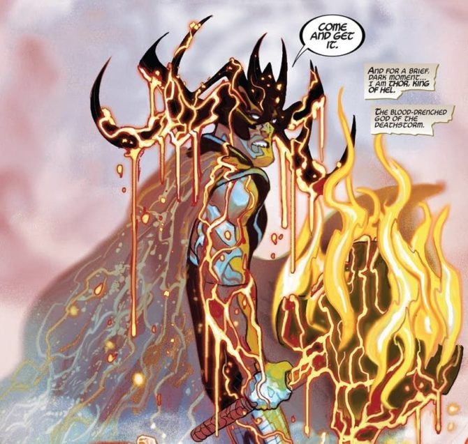 Mesmo com um exército de Valquírias e asgardianos, Thor recorre a uma arma incomum: a coroa de Hela, fazendo com que o herói transforme-se no novo Deus da Morte e Rei de Hel. Confira a imagem abaixo.