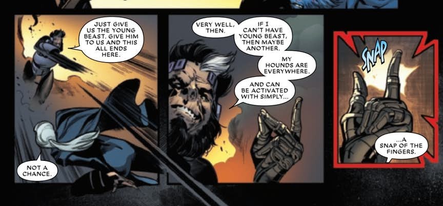 Com o estalar, Ahab consegue transformar alguns mutantes, entre eles Wolverine, em um de seus cães de caça. O que acontece é que os X-Men foram enganados pelo vilão.