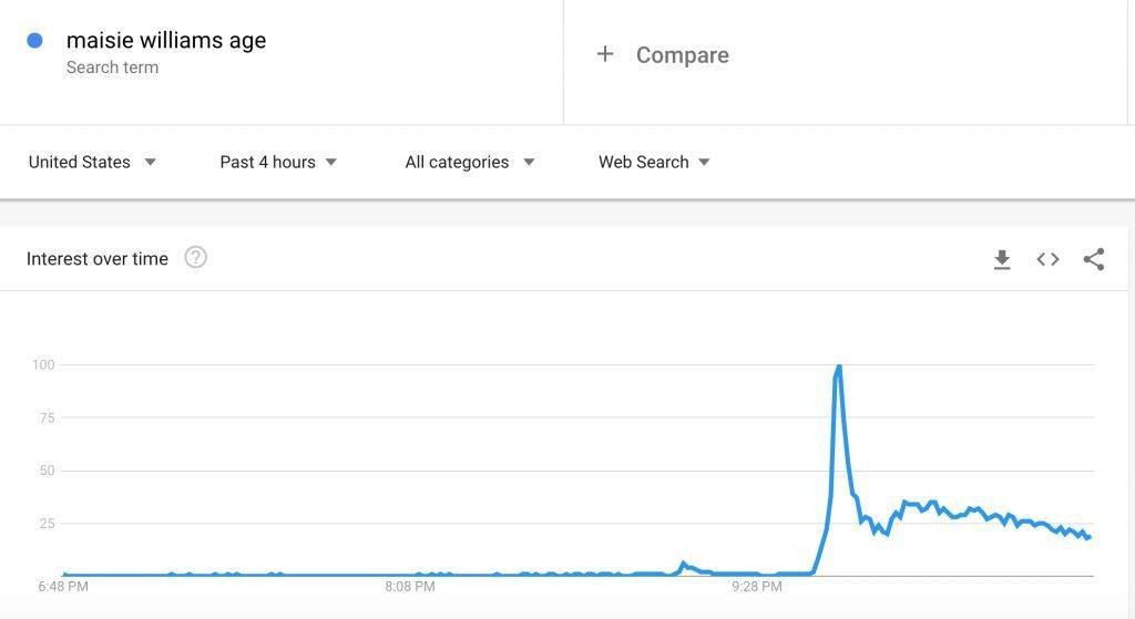 Em um gráfico no Google Trends, foi observado que a idade de Maisie Williams foi um dos assuntos mais buscados depois do segundo episódio da 8ª temporada de Game of Thrones.