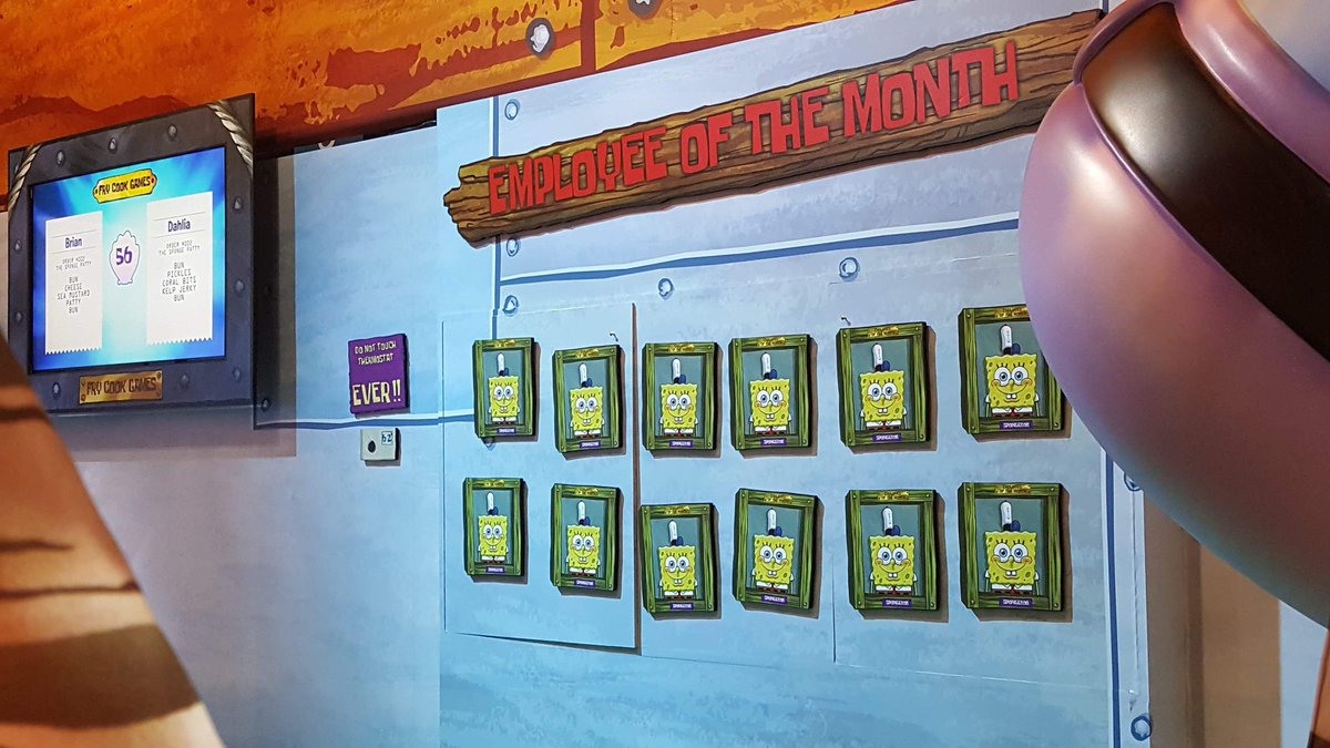 O cenário conta com diversos detalhes vistos no desenho. Um deles, por exemplo, são os diversos quadros de funcionário do mês do Bob Esponja.
