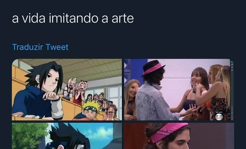 Um meme publicado no Twitter compara alguns momentos do BBB 21 com cenas de Naruto. Vemos um paralelo entre Fiuk e Sasuke, ambos rodeados por mulheres apaixonadas.