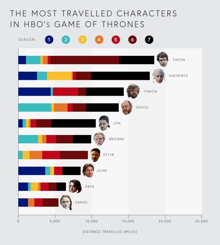 O resultado é surpreendente, já que Theon (Alfie Allen) lidera a pesquisa com quase 20.000 milhas (ou 32.186 quilômetros) viajadas, quase todas durante a sexta temporada.