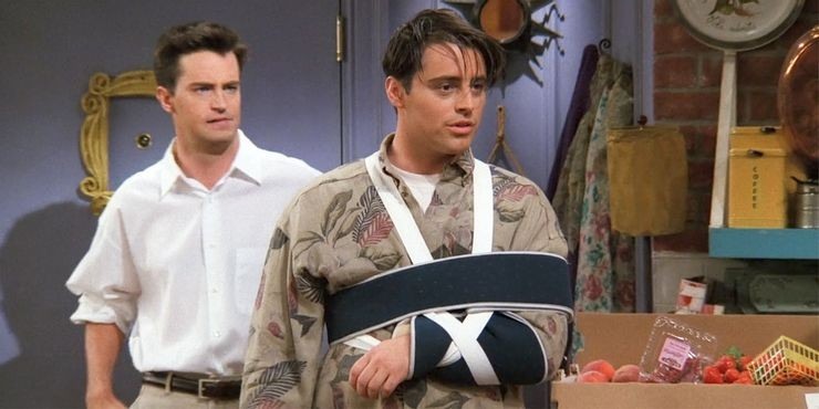 Na cena em questão de Friends, ouvimos Joey pulando na cama e pouco após ouvimos ele caindo. Na cena seguinte ele já aparece com o braço imobilizado.