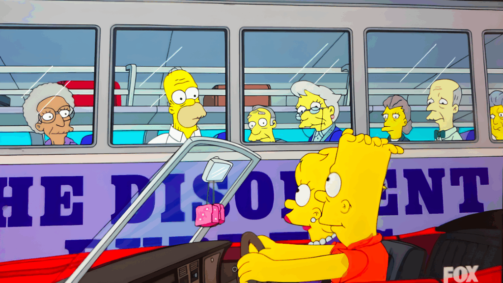Bart, por outro lado, continua morando na casa dos pais e montou um esquema curioso: cuida de Homer e seus amigos idosos em troca dos cheques de aposentadoria deles. O que parece um golpe é, na verdade, uma forma caótica de carinho.