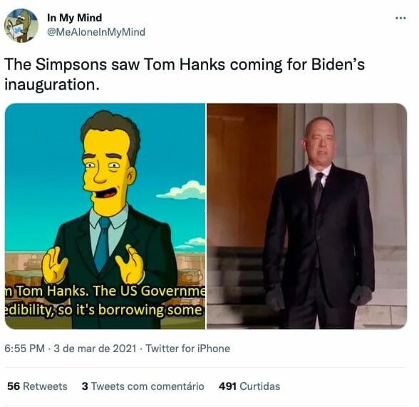 Os fãs acharam uma ligação envolvendo Tom Hanks. Em 2021, por conta da pandemia e o motim no Capitólio em janeiro, a entrada de Joe Biden no governo se deu por um evento feito para TV. O astro ficou com a apresentação.