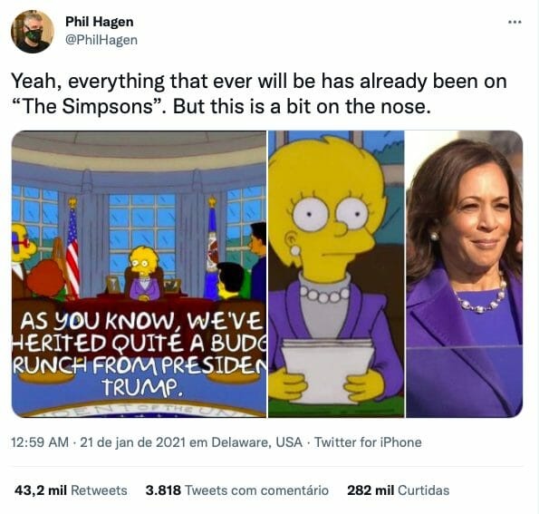 Kamala Harris se tornou a primeira vice-presidente mulher dos EUA, logo em governo após o de Donald Trump (como Lisa como primeira presidente em Os Simpsons). No mesmo episódio de 2000, citado na primeira previsão, Lisa aparece com um figurino roxo e um colar, em roupa repetida por Kamala Harris na cerimônia de início dos trabalhos do governo de Joe Biden nos EUA.