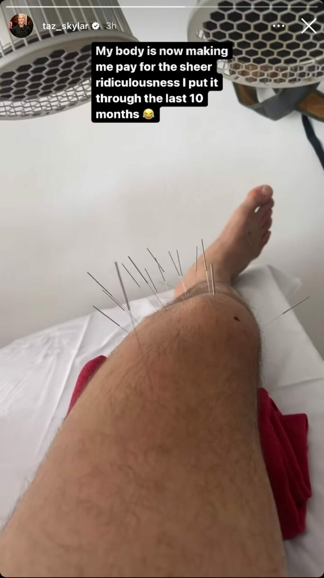 Skylar postou em seus Stories uma foto fazendo acupuntura nas pernas, resultado dos meses interpretando o cozinheiro, que para preservar suas mãos para a culinária sempre luta usando os pés.
