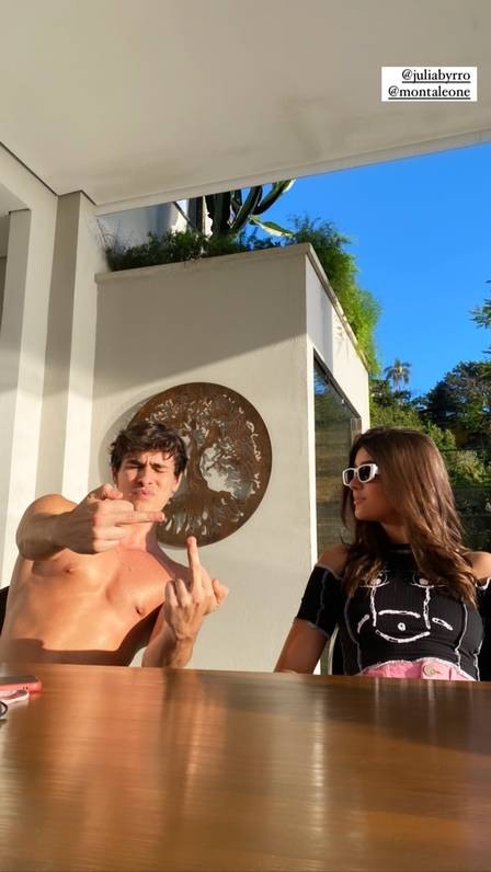 O novo casal apareceu em uma foto publicada por Johnny Massaro, que mostra os dois sentados lado a lado. Bruno Montaleone mostra os dedos do meio para a câmera e Júlia, de óculos escuros, olha para ele.