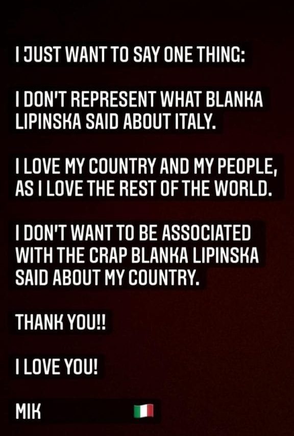 Em julho, a autora passou um período na Itália e publicou uma mensagem aos fãs quando estava voltando para Polônia. No texto, Blanka Lipinska disse odiar o país europeu.