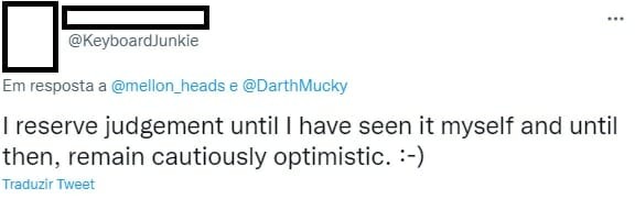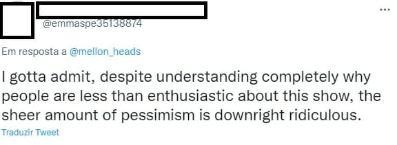E desses milhões houve quem adorou, o usuário @emmaspe35138874, “Eu tenho que admitir, a enorme quantidade de pessimismo é absolutamente ridícula”, festejando. Teve quem criou um novo termo para explicar o que sente, @mathiasthgreat: “Eu estou super nerd por essa série”. E ainda teve quem concordasse que temos que esperar, para criticar. @keyboardjunkie: “Vou falar apenas quando assistir, mas estou otimista”.