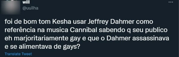 Já Kesha, em Cannibal, diz: “Seja muito doce, e você será um caso perdido. Sim, eu vou fazer como Jeffrey Dahmer”.