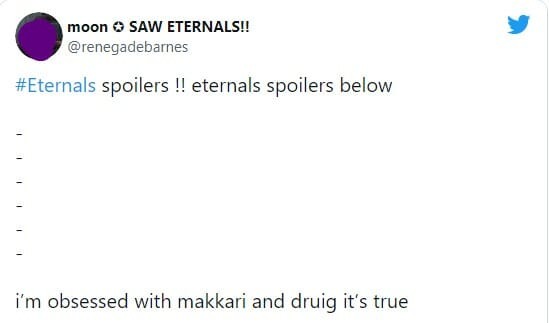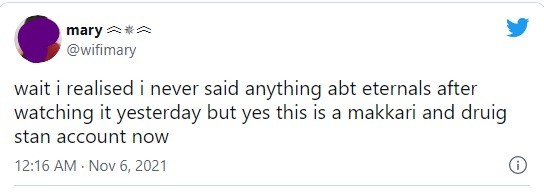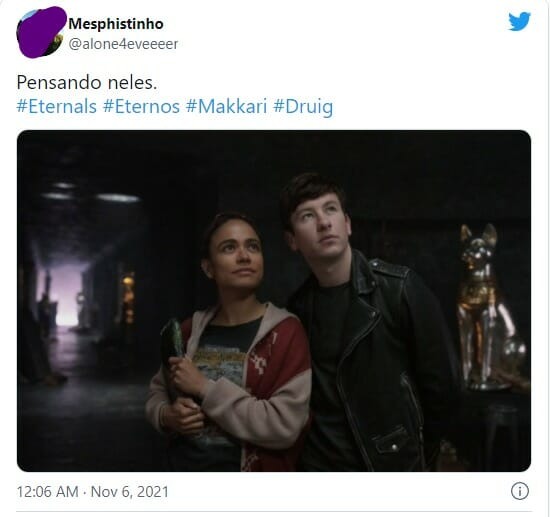 “Percebi que nunca disse nada sobre Eternos depois de assistir o filme ontem, mas sim, esta é agora uma conta de fã de Makkari e Druig”, disse uma fã.