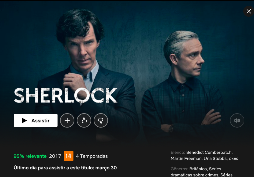 O que acontece é que a série Sherlock, uma das histórias mais elogiadas sobre o famoso detetive, deixa a Netflix em 30 de março. A informação está na própria plataforma.