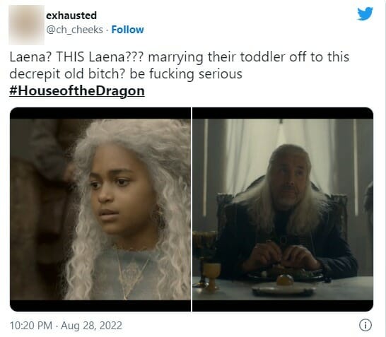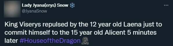 “Rei Viserys sente repulsa pela Laena de 12 anos, apenas para se casar com a Alicent de 15 anos, 5 minutos depois”, reclamou outra fã.
