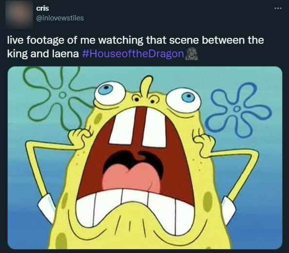 “Gravação ao vivo de eu vendo aquela cena entre o rei e Laena”, tuitou um fã.