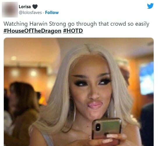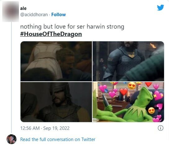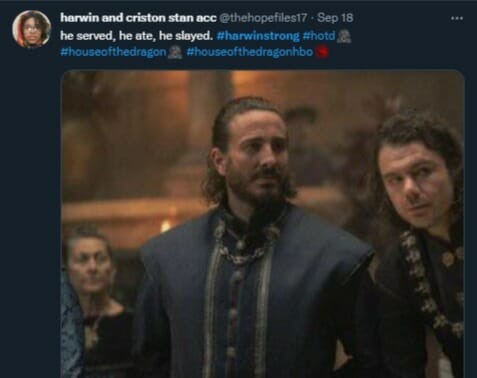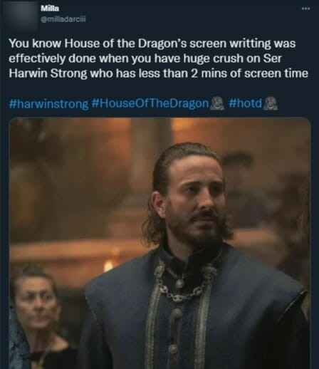 “Você sabe que o roteiro de A Casa do Dragão foi bem feito, quando você tem um crush enorme em Ser Harwin Strong, que apareceu em menos de 2 minutos da série”, tuitou outra fã.