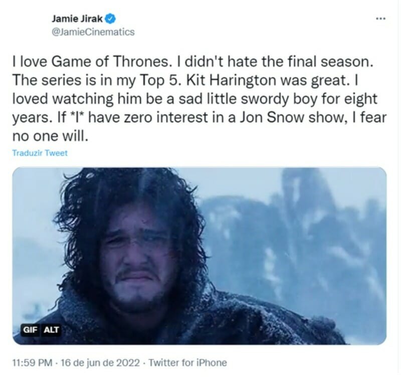 “Se *eu* não tiver nenhum interesse em um show de Jon Snow, temo que ninguém o fará”, tuitou uma fã.