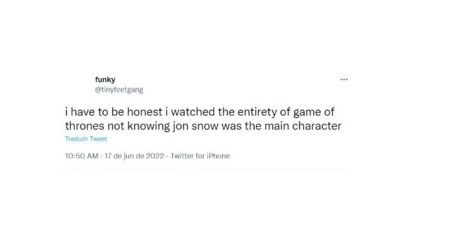 “Eu tenho que ser honesto eu assisti Game of Thrones inteiro sem saber que Jon Snow era o personagem principal”, tuitou outro fã.