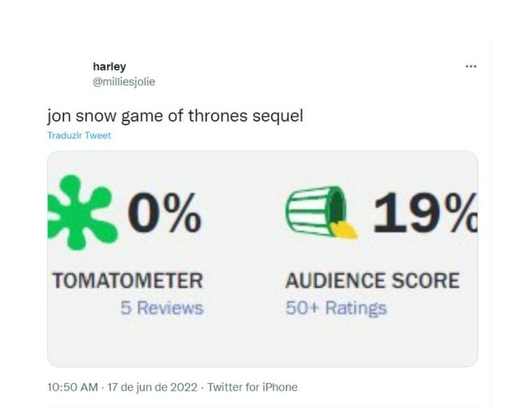 “Sequência de Jon Snow de Game of Thrones”, previu a fã, com uma nota falsa no Rotten Tomatoes.