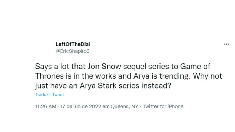 “Diz muito que a sequência de Jon Snow para Game of Thrones está em andamento e Arya está nos trendings. Por que não ter uma série de Arya Stark?”, tuitou outro fã.